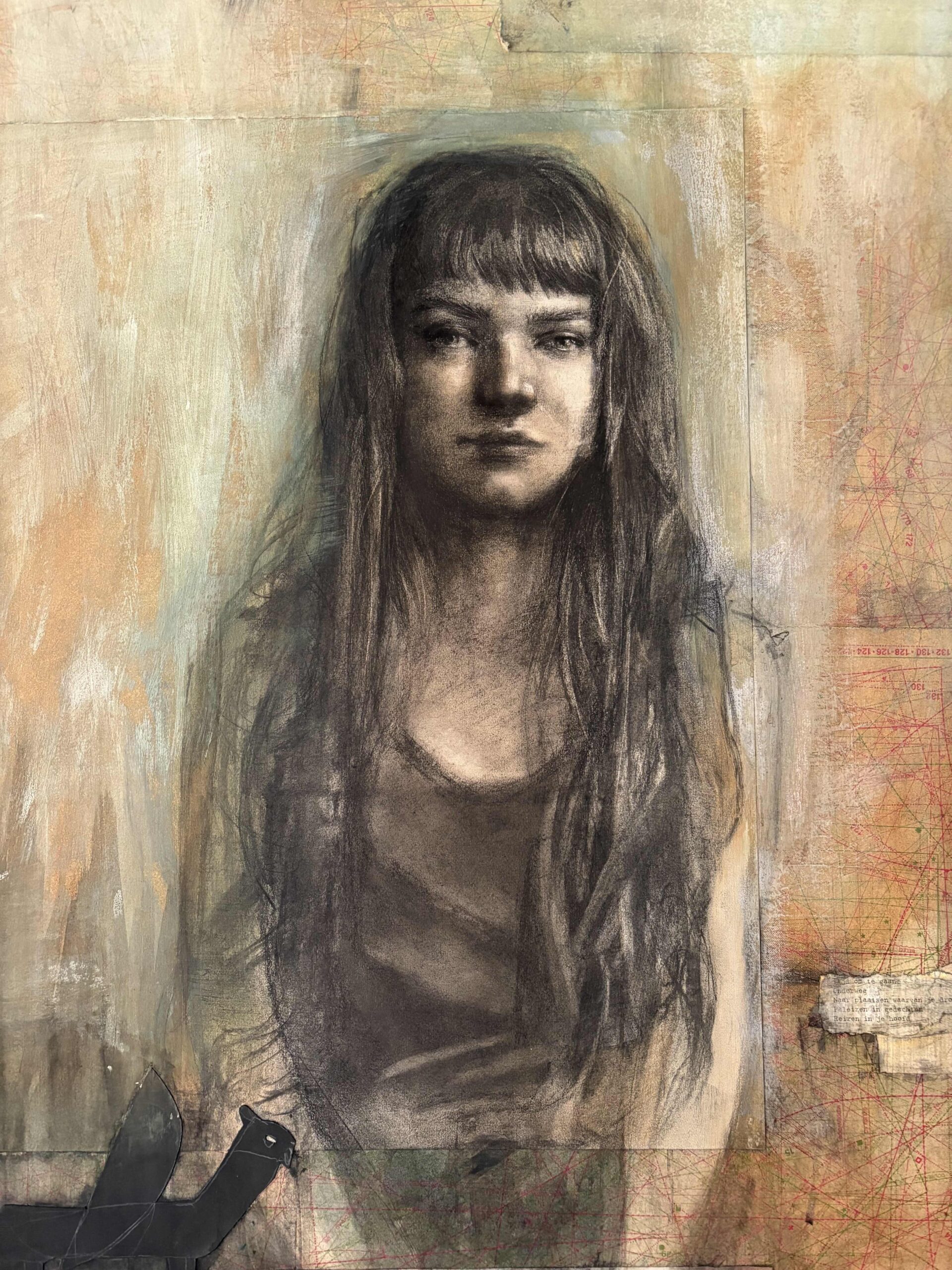 Houtskool, mixed media en collage op doek.