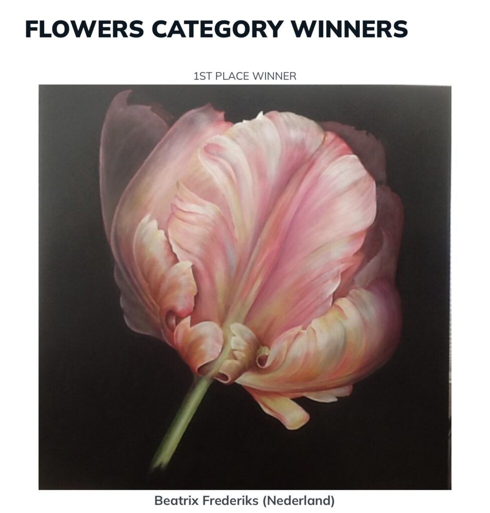 Master of Realism Beatrix Frederix heeft de eerste prijs gewonnen in de categorie „Bloemen” van de Best Art Awards.