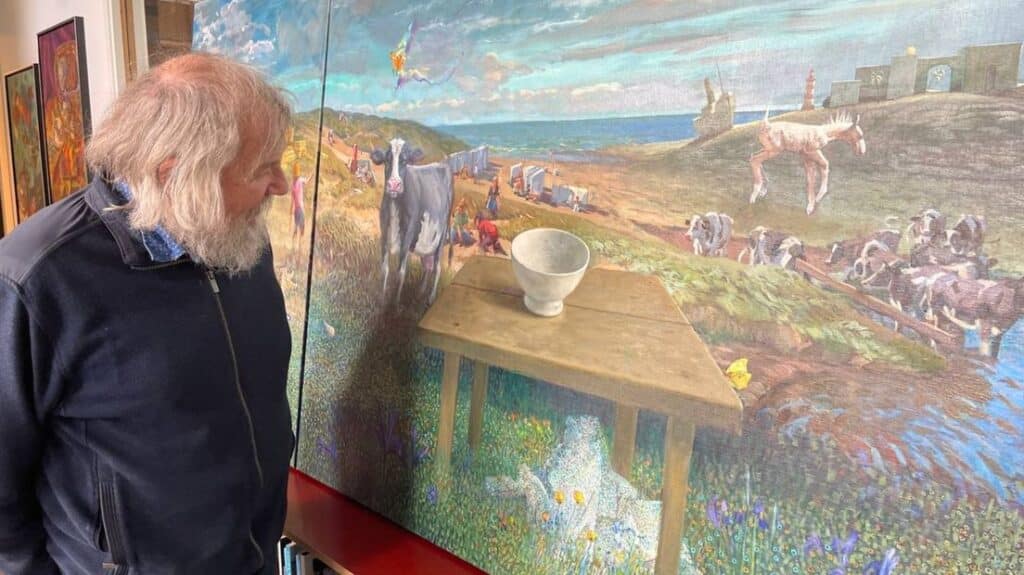 Foto: Henk Helmantel kijkt naar zijn bijdrage aan het drieluik. © Jan Been/RTV Noord