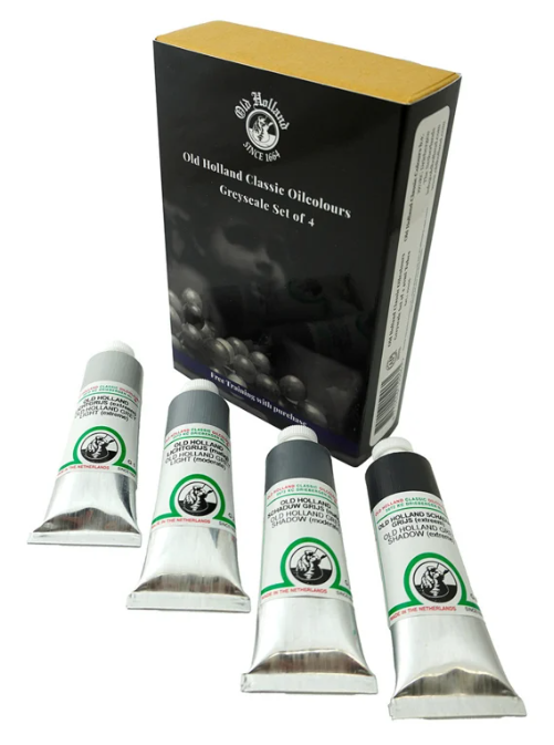 The set contains four unique, professional gray tones of Old Holland Classic oil paint in 40 ml tubes: Light Gray Extreme, Light Gray Moderate, Shadow Gray Moderate, and Shadow Gray Extreme.